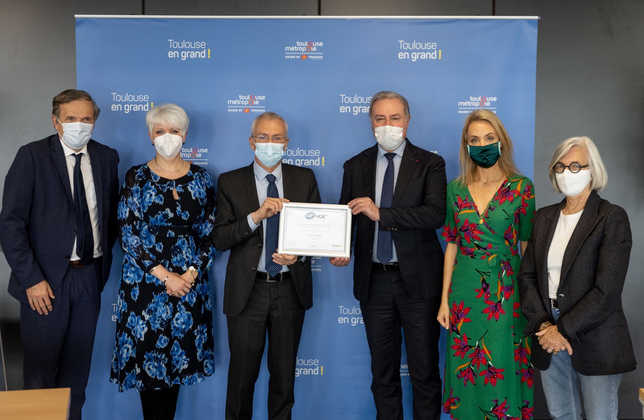 Ce jeudi 18 Mars 2021, Patrick Nossent, Président de Certivéa, est venu à Toulouse pour remettre à Jean-Luc Moudenc, Maire de Toulouse, Président de Toulouse Métropole, en présence d'Annette Laigneau, Vice-présidente de Toulouse Métropole, Présidente d’Europolia, de Line Malric, Vice-présidente du Conseil départemental de la Haute-Garonne représentant Georges Méric, président du Conseil départemental de la Haute-Garonne et de Nadia Pellefigue, Vice-présidente de la Région Occitanie, Vice-présidente d’Europolia, représentant la Présidente de Région Carole Delga, la distinction « Haute Qualité Environnementale » (HQE) avec la certification du MEETT « HQE de niveau exceptionnel & 4 étoiles en énergie ».