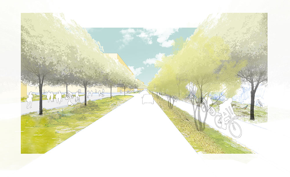 Hypothèse d’aménagement du boulevard urbain « Sud » (double sens maintenu, usage piétons/cycles retrouvé, espaces végétalisés) – Image d’ambiance non contractuelle - Crédit Battle i Roig.